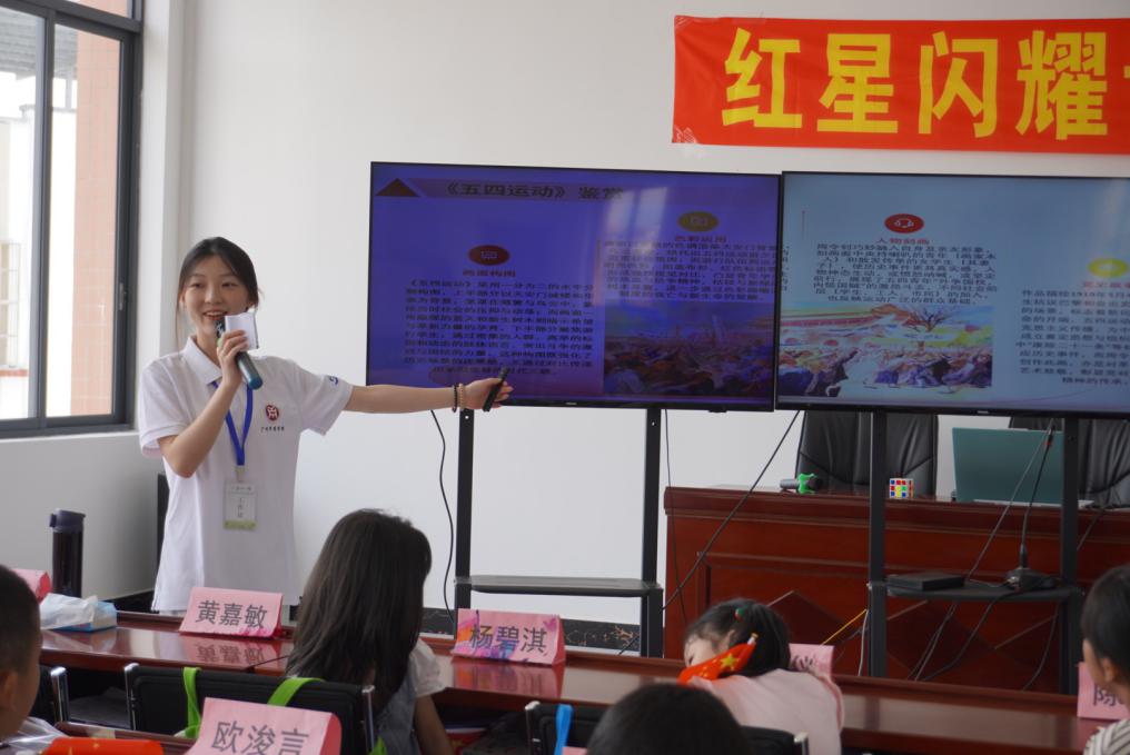 就像画笔能勾勒遥远的峥嵘,身边的土地也藏着触手可及的红色记忆。实践团成员给小朋友讲述着广宁的红史:广宁的红,藏在农运烈火里——1924年的减租斗争轰轰烈烈,1928年的苏维埃政府红旗飘扬;藏在抗战烽火中——百寮顶伏击战智勇双全,扶罗口的枪声里藏着不屈;更藏在如今的江美村,红色旅游与稻田相映,成了最鲜活的“教科书”。