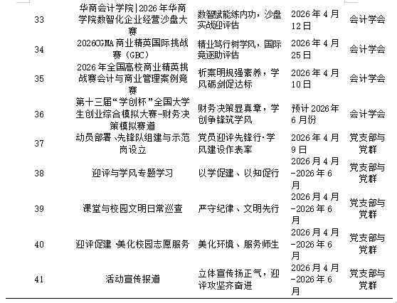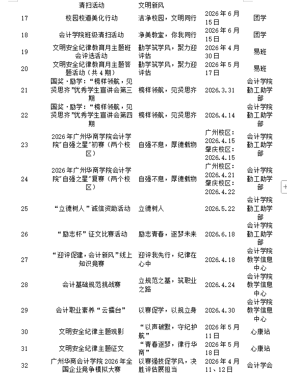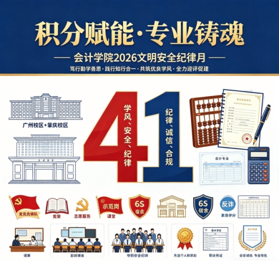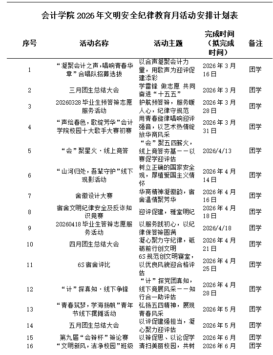 目前,双校区学生组织正按《太阳成tyc9728集团2026年文明安全纪律教育月活动安排计划表》(文档1)推进活动报。学院呼吁全体师生以“会计人”的严谨参与活动,让“笃行勤学”成为习惯,让“合规诚信”融入血脉,共同书写太阳成tyc9728集团学风建设新篇章!