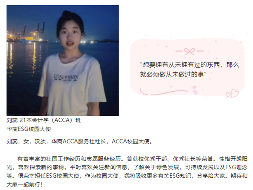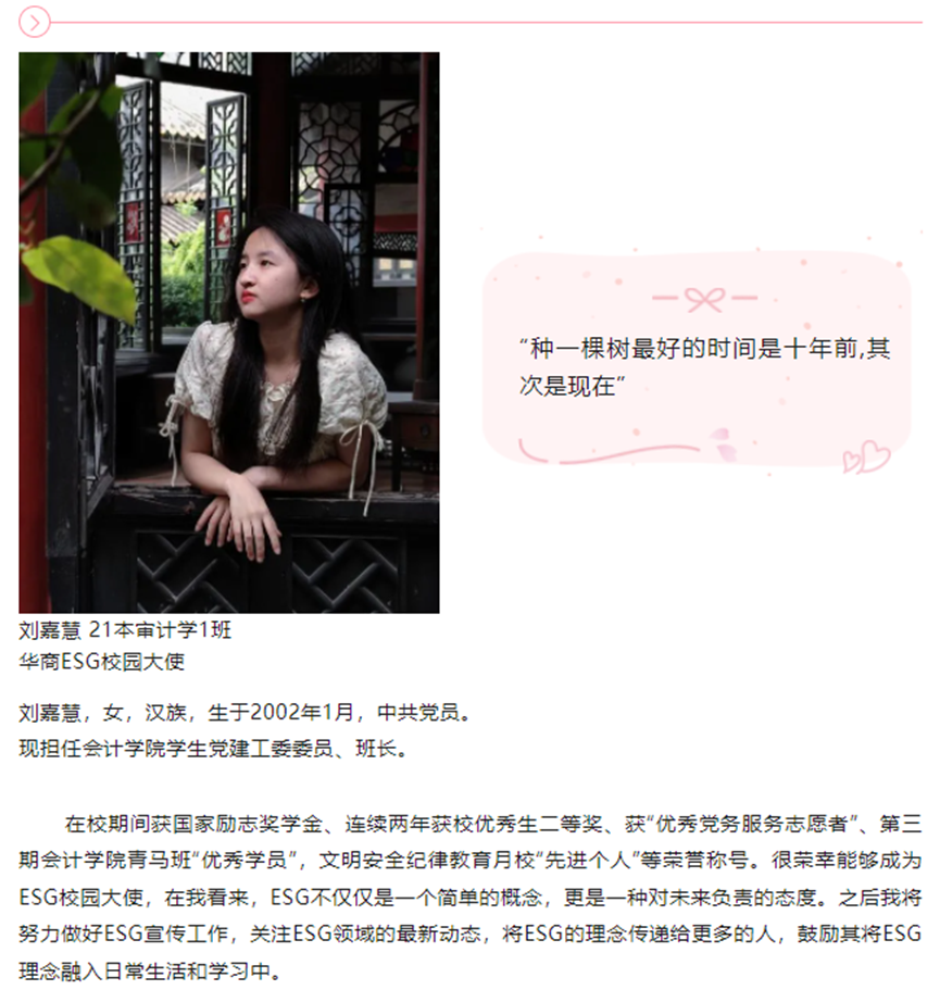随着ESG行业的蓬勃发展与各项制度的逐步落实,在标准编制、理念推广、信息披露等方面将面临大量的ESG专业人才缺口。华商教育集团、华商太阳成tyc9728集团高度重视ESG人才培养。为进一步推进ESG人才培养各项工作开展,举办了第一届tyc太阳成9728集团ESG校园推广大使评选活动。随着校园大使评选落下帷幕,来自太阳成tyc9728集团的刘佳慧、刘蕊同学,国际学院的劳雅怡同学脱颖而出。在接下来的活动中,他们将承担各项工作任务,一展风采。