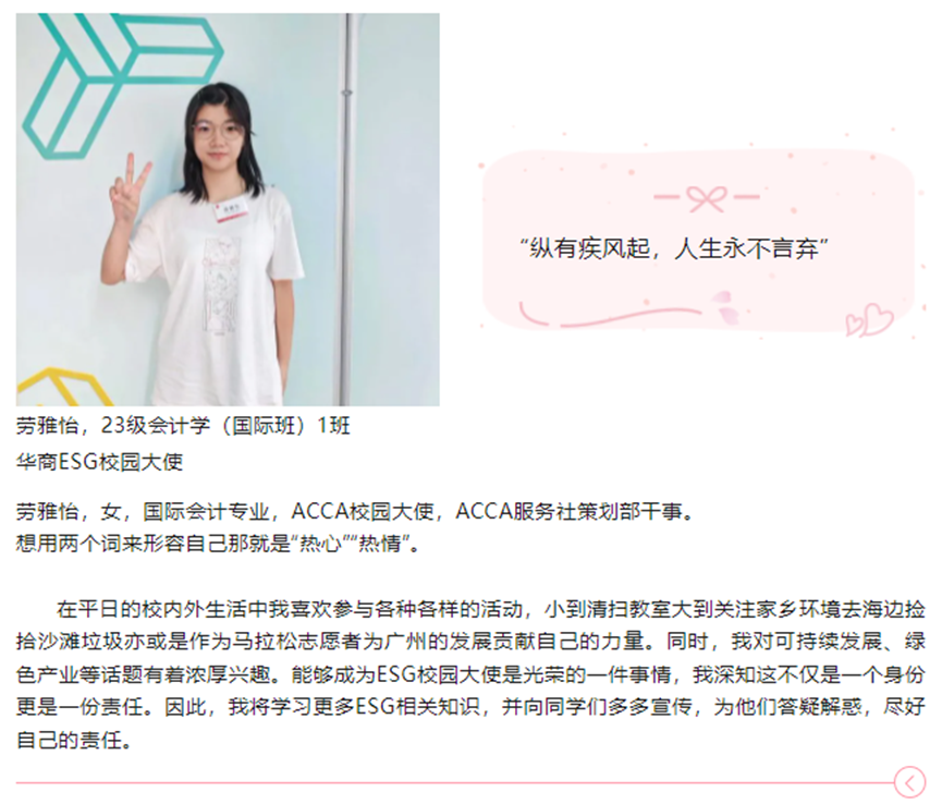ESG校园大使作为学校委任的形象大使和ESG宣传发言人,以及学校与企业和大学生沟通的桥梁,在本校校内为同学们解答各种关于ESG研学活动、ESG工作坊等相关的问题,收集并及时反馈同学们的疑问。
