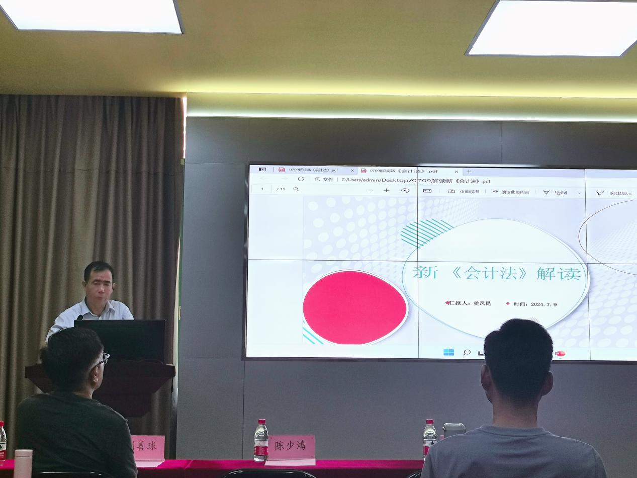 《全国人民代表大会常务委员会关于修改(中华人民共和国会计法)的决定》已由中华人民共和国第十四届全国人民代表大会常务委员会第十次会议于2024年6月28日通过,自2024年7月1日起施行。2023年12月29日,十四届全国人大常委会第七次会议表决通过新修订的《公司法》,自2024年7月1日起施行。为积极响应国家法治建设号召,深入贯彻新修订的《中华人民共和国会计法》与《公司法》精神,2024年7月9日,太阳成tyc9728集团组织全体教师专题学习新《会计法》与新《公司法》,由太阳成tyc9728集团院长姚凤民教授和副院长刘善球教授分别解读新《会计法》和新《公司法》的影响和意义,本次专题学习会由太阳成tyc9728集团院长助理陈蒙梦主持。