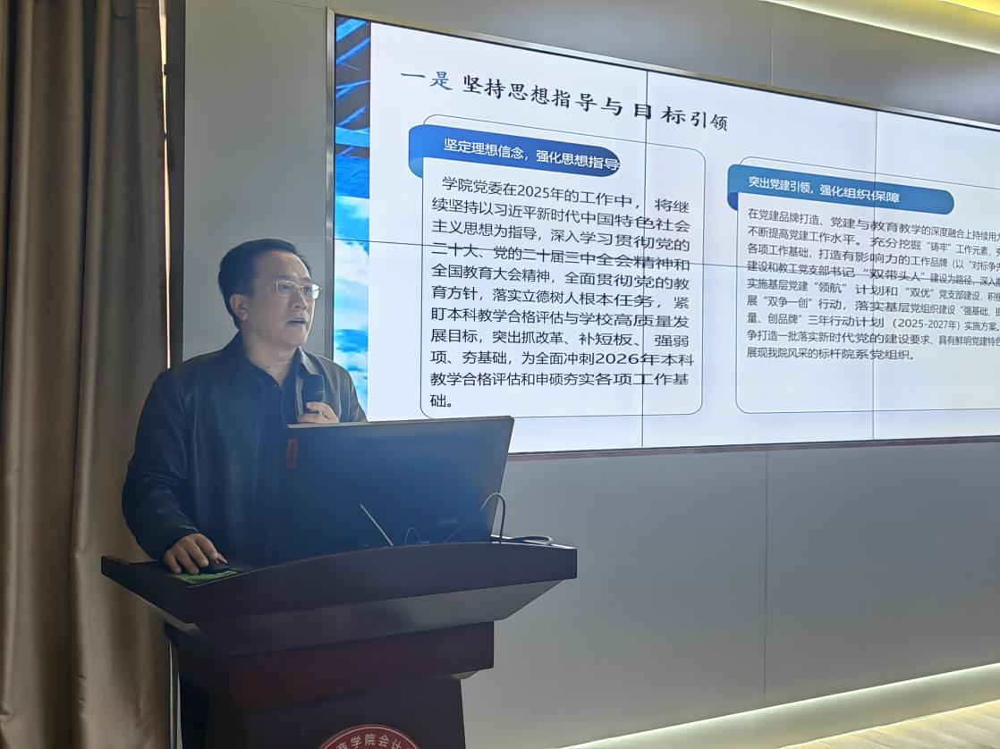 学院姚凤民院长以“以合格评估为核心,抓实抓好各项工作”为主题进行了工作的全面部署。对学院2024-2025学年第二学期工作从“完成的任务一项也不能少、既定的目标一个也不能丢、工作的标准一点都不能低、执行的效率一丝都不能降、团队的协作一丝都不能乱”五方面进行全面部署。提出了学院2025年的任务是重点围绕合格评估、学科建设、产业学院建设、学风与教风建设、就业与招生工作、教学质量提升、教学与学术交流、党建与学生管理等八大领域展开,其中,合格评估是学院核心工作。2025年学院的工作目标则涵盖合格评估目标、学科建设目标、产业学院建设目标、队伍建设目标、学生就业与考研目标、课程建设目标、专业建设、教学竞赛及学科竞赛目标、教师培训目标、校庆工作目标等各个方面。