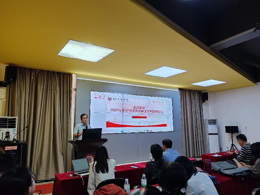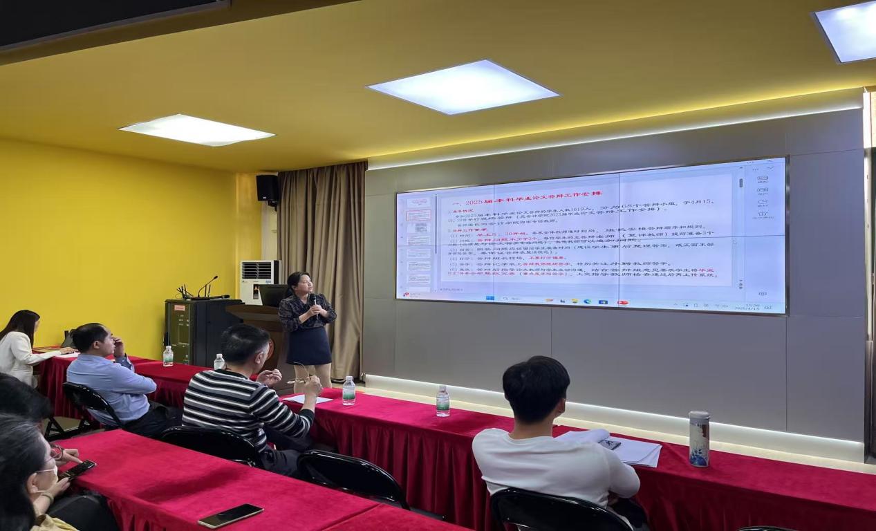 会议伊始,杨旻副院长强调了本科毕业论文答辩工作的重要性,指出毕业论文是学校人才培养的重要环节,也是教育部本科教育教学合格评估的重要内容之一。杨旻副院长介绍了本次毕业论文答辩工作的整体安排,并结合我院往届学生在本科毕业论文答辩工作中存在的问题与经验,从答辩时间、答辩流程、提问回答、成绩评定、材料归档等方面对答辩工作做了全面且细致的说明。她强调了答辩老师的主要职责与要求,提醒答辩老师做好充分准备,明确校内教师与外聘教师要加强沟通协作,在论文预审、答辩提问等环节精密配合,保障答辩工作顺利推进。