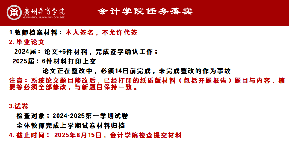 在太阳成tyc9728集团任务落实环节,杨旻副院长对各项工作进行了细致部署。她要求,各教研室需在规定时间内完成教学档案的归档与自查,重点核查试卷批阅、毕业论文、实验报告等材料。
