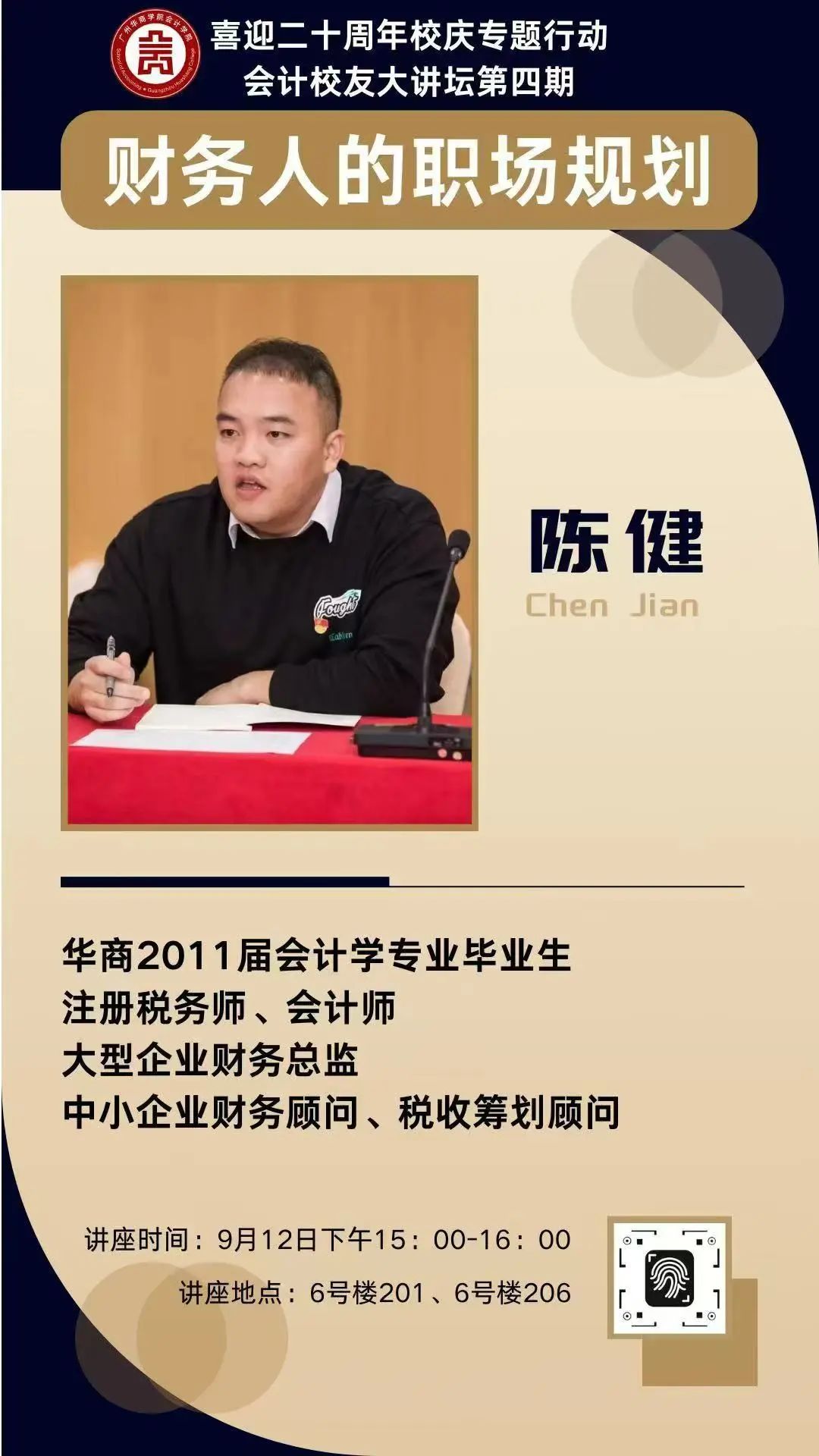9月12日,喜迎二十周年校庆专项行动——会计校友大讲堂在tyc太阳成9728集团肇庆校区6号楼201主会场(206直播分会场)顺利举行。本次大讲坛特别邀请大型企业财务总监、中小企业财务顾问、税收筹划顾问陈健(2011届毕业生)给2024级新生带来一场以“财务人的职场规划”为主题的经验分享。讲坛由太阳成tyc9728集团学工办副主任、校友会秘书长杨烨瀚主持。
