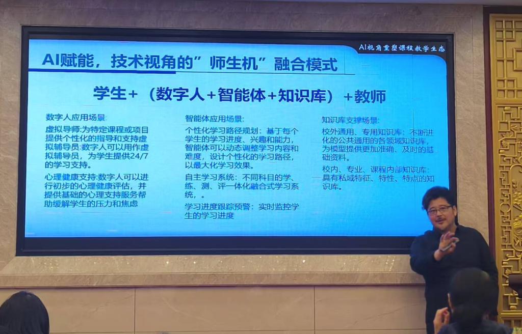 惠州学院索剑副教授进行了以“AI视角重塑课程教学生态”为主题的分享。索教授深入分析了人工智能技术如何去改变教育生态,并通过教学要素和教师素养等方面阐述了AI赋能教学的两种途径,结合技术的实际应用为大家进行了生动有趣的演示。未来的课堂将不再是单向传授,而是人机协同、动态适应的智慧学习空间。教师应积极拥抱AI,探索更具创新性的教学方法。
