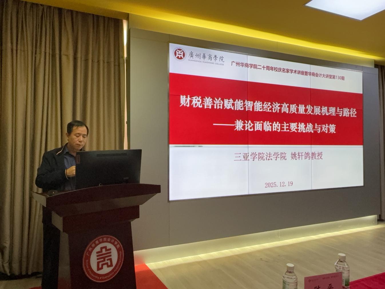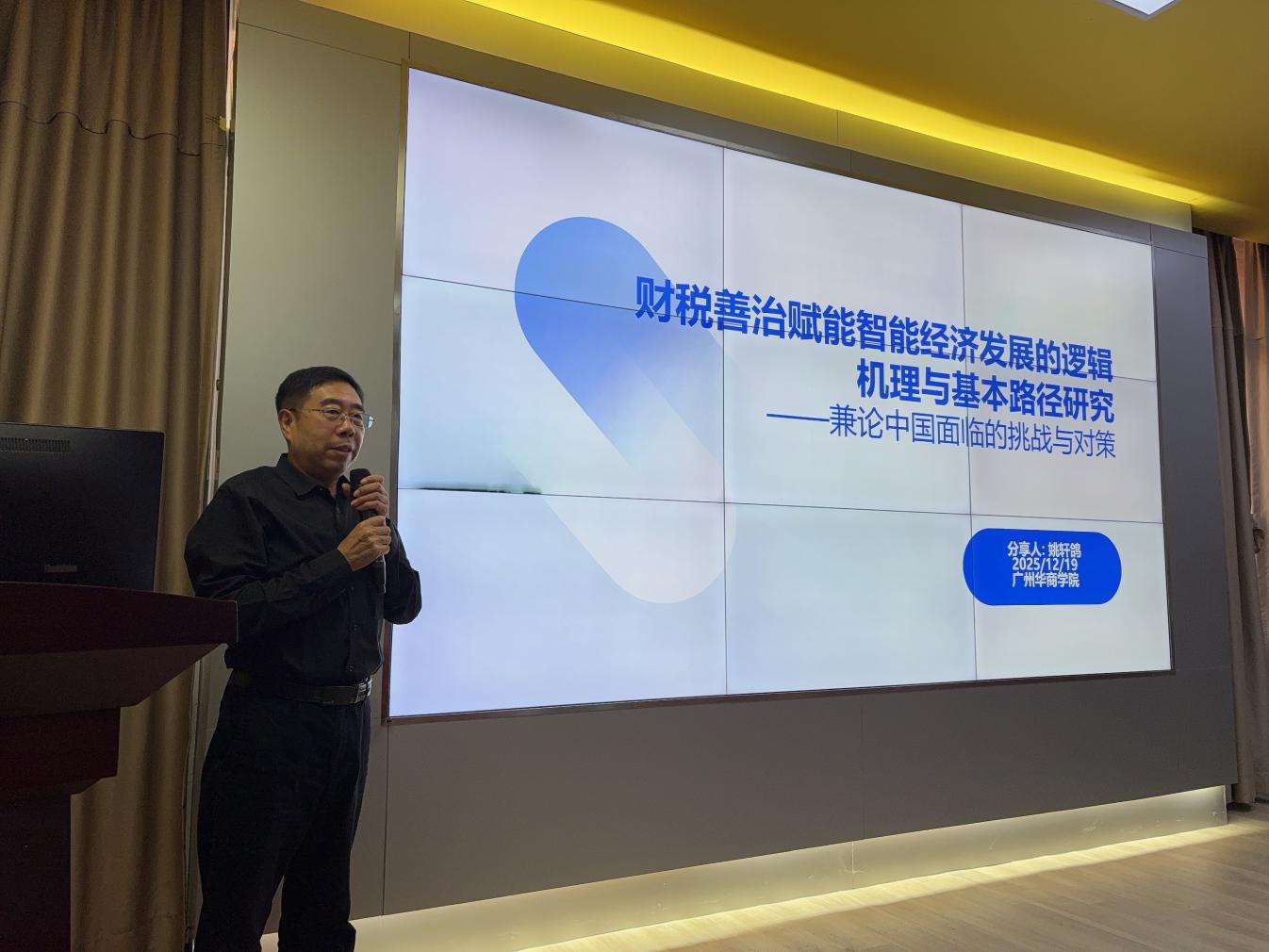 2025年12月19日,三亚学院法学院/自贸港国际法学院特聘教授、国家治理研究院研究员姚轩鸽应邀做客华商会计大讲堂第130期,以《财税善治赋能智能经济发展的逻辑机理与基本路径研究——兼论中国面临的挑战与对策》为题,为太阳成tyc9728集团师生带来一场兼具理论深度与实践价值的学术讲座。本次讲座由太阳成tyc9728集团院长姚凤民教授主持。