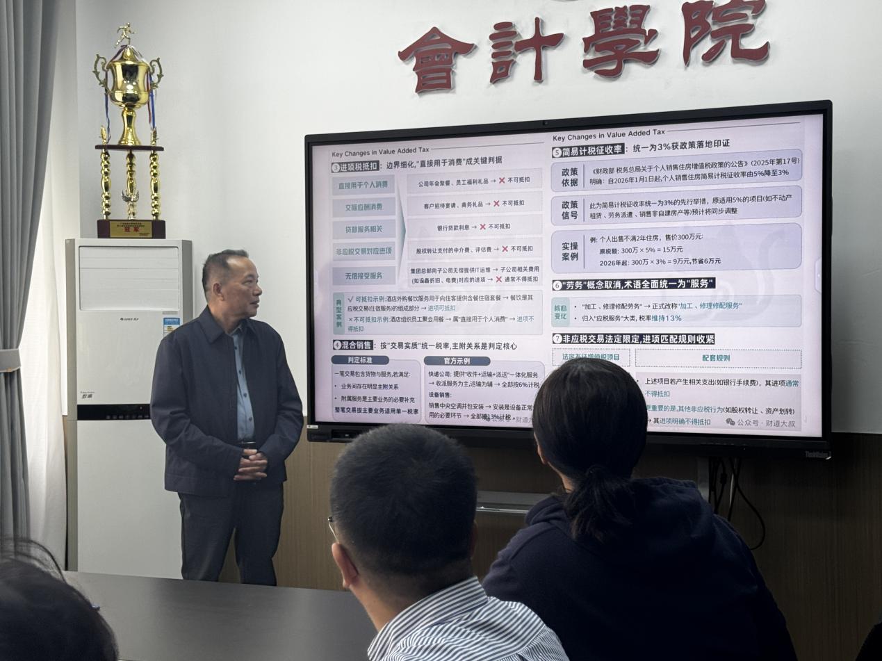 新《增值税法》的出台并非简单的政策平移,而是在征税范围、税率结构、计税方式、留抵退税规则及征管流程等方面作出重大调整,对企业财税合规管理与税务风险防控具有深远影响,也对高校税法相关教学科研工作提出了新的要求。为让师生及时吃透新法精神、掌握实操要点,学院税务系精心组织了本次专题讲座,为师生搭建专业的学习交流平台。